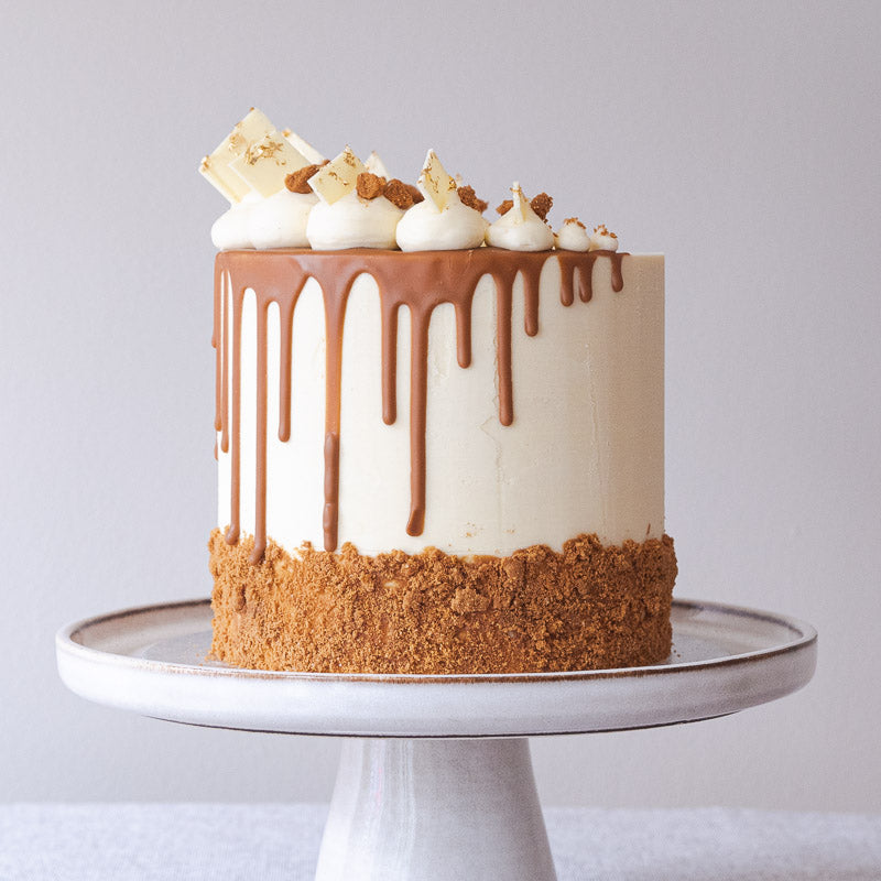 Layers of Biscoff sponge, filled with Biscoff buttercream and covered with decadent white chocolate ganache, a Biscoff drip and piped vanilla buttercream bulbs, shards of white Belgian chocolate, Biscoff crumb and edible gold leaf. Enjoy on any occasion - Just add a message plaque.